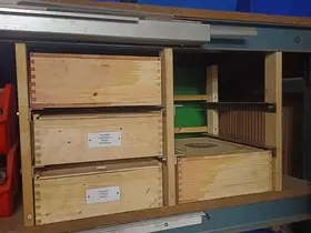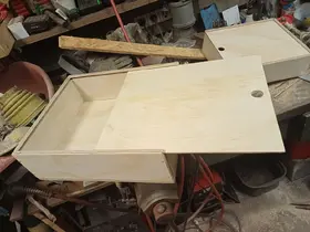 die Suche nach Weinkisten war leider erfolglos bzw. lagen die Preisvorstellungen der Anbieter jenseits von gut und böse. Also gings in den Baumarkt Sperrholz zuschneiden lassen und die Kisten eben selber bauen. Knapp 20 Euro für das Holz war okay. Die Nut für den Schiebedeckel hab ich mit der Akkuhandkreissäge auf einer Halterung gesägt, 2 parallele Schnitte, Zwischensteg rausgebrochen. Boden und Seitenteile verschraubt und verleimt, Schiebedeckel mit Griffloch. Einteilungen und Schilder kommen je nach Inhalt später ran. An allen Kisten hab ich Hohlgriffe, da mußt erst mal drauf kommen wie die im Fachjargon heißen, angeschraubt.